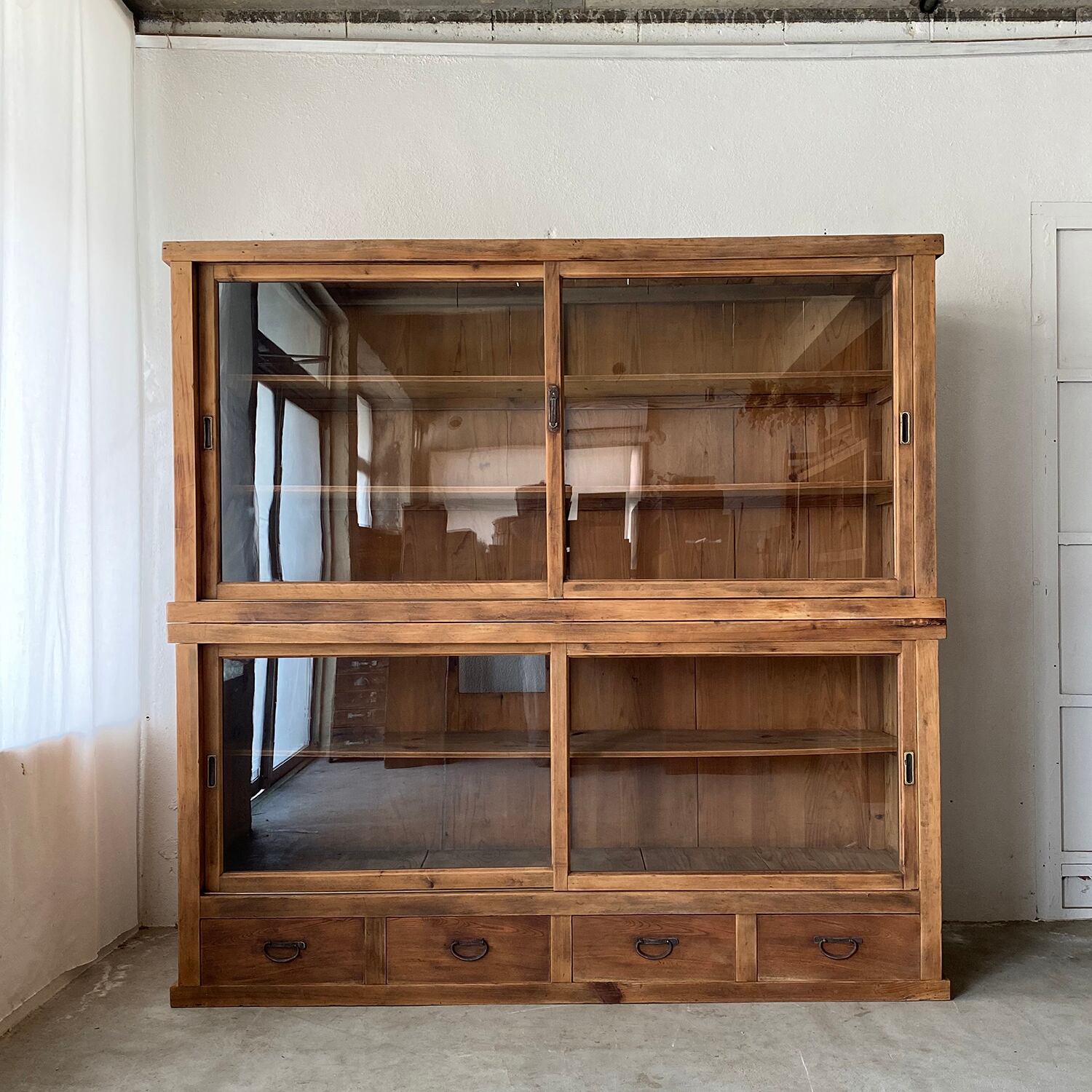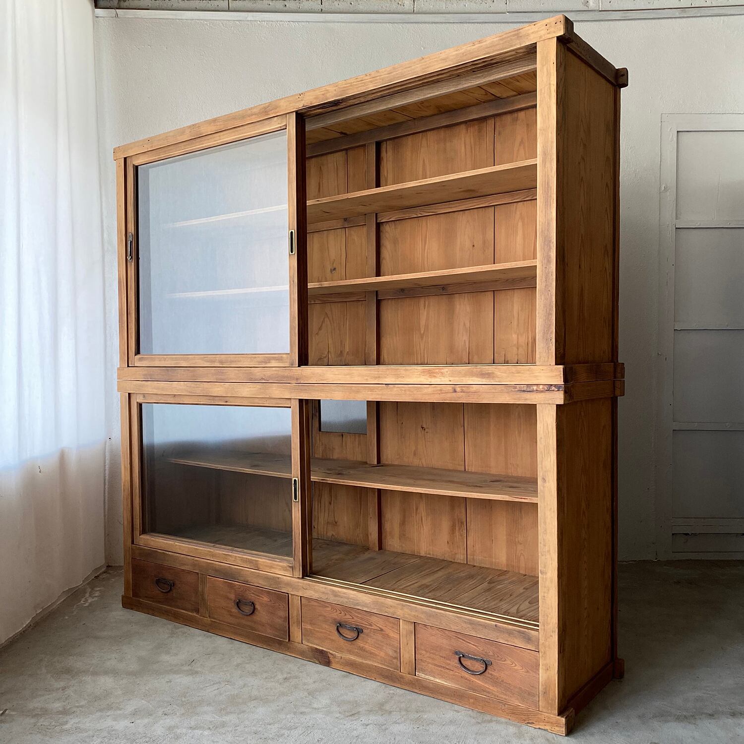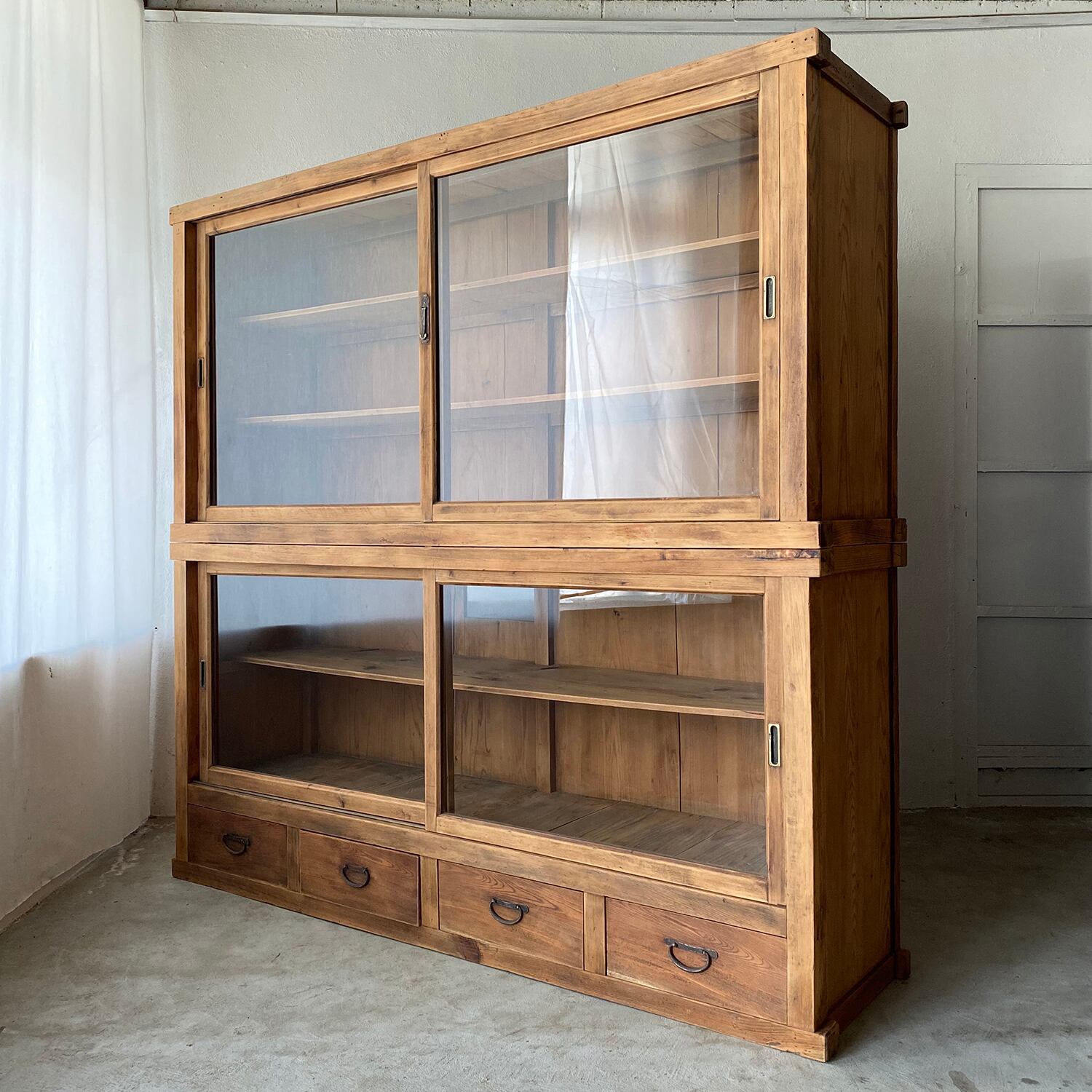 2段重ねのガラス戸棚で、上下に分割されています。
